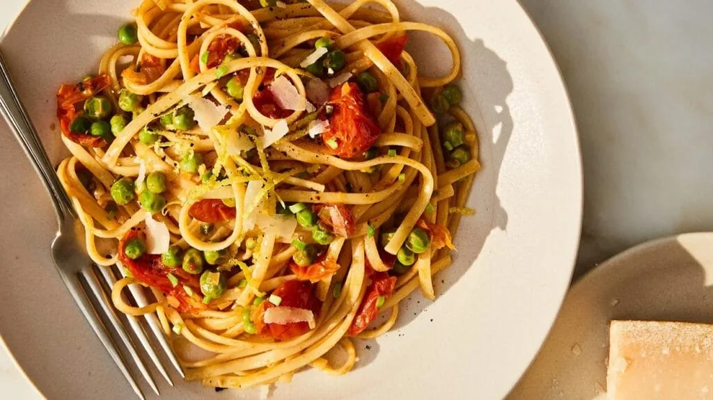 اسپاگتی با سس گوجهفرنگی و نخود فرنگی